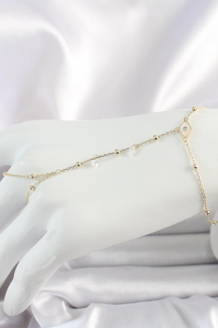 Göz figürünün nazardan koruduğuna inanılırken, göz alıcı mavi taşlar bu şık aksesuarı enerjik ve özgün bir hale getiriyor. Topçuk detayları modern bir dokunuş sağlarken, ayarlanabilir zinciri sayesinde bileğinize tam uyum sunar.