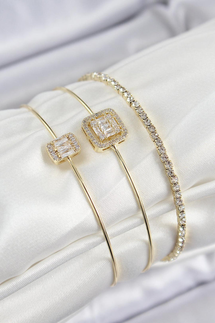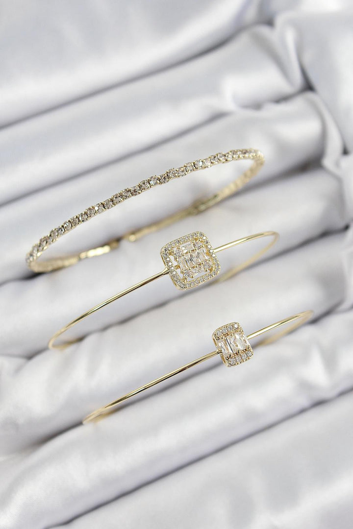 Gold renk pirinçten üretilen, parlak zirkon taşlı baget modellerinden oluşan özel Qiva™ Vip Gold Baget Set, üçlü bileklik tasarımıyla şıklığınızı katlıyor. Hafif ve dayanıklı yapısıyla günlük veya özel günler için mükemmel seçim.